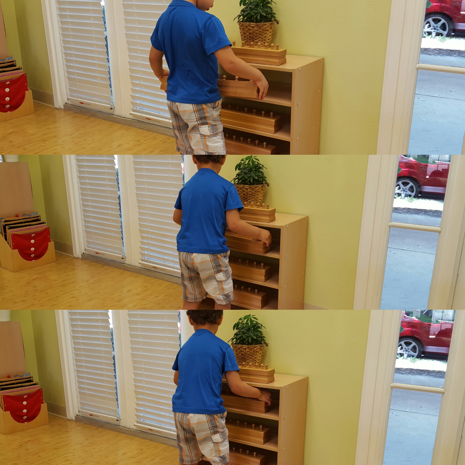 Here, my kiddo is returning his lesson to the second shelf. The long rectangular shape needs precise calculations. He did it!!!